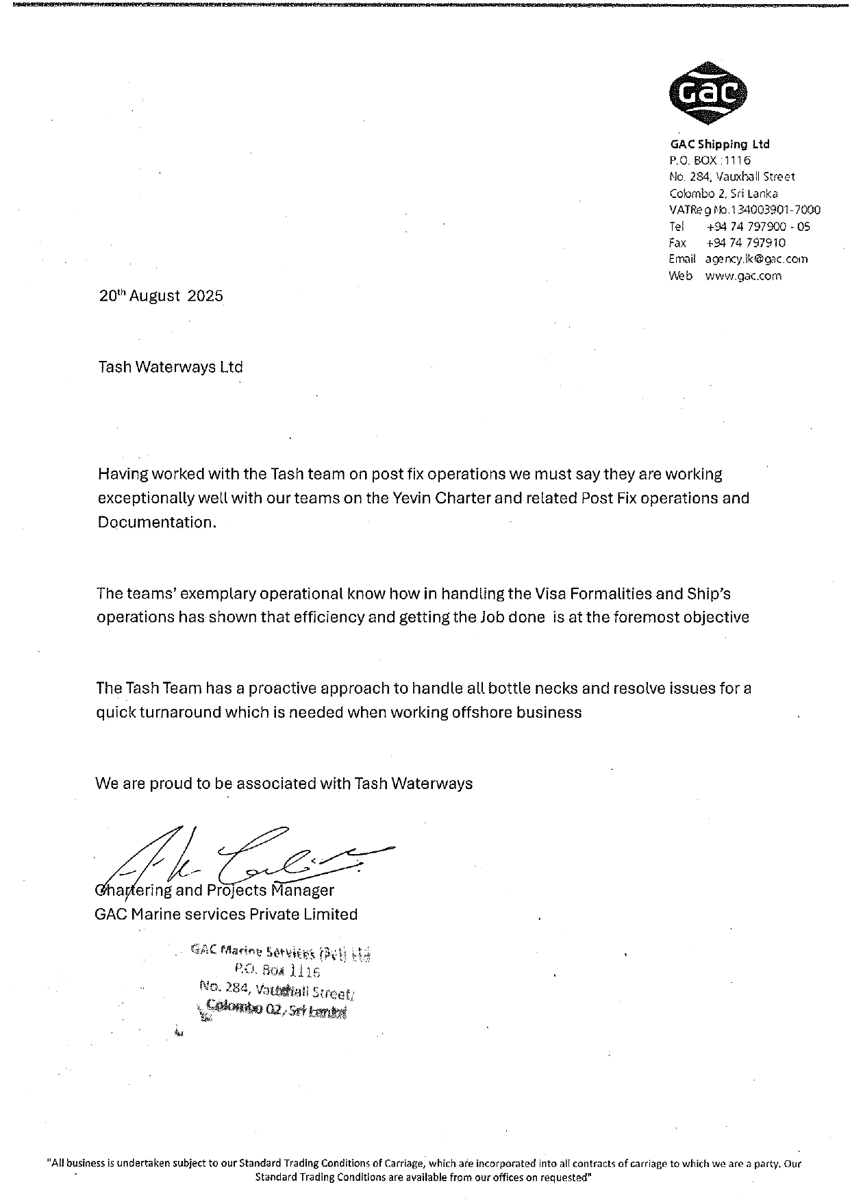 We value our partnership with TASH WATERWAYS SHIPPING LLC and would confidently recommend their services to others in the maritime industry.